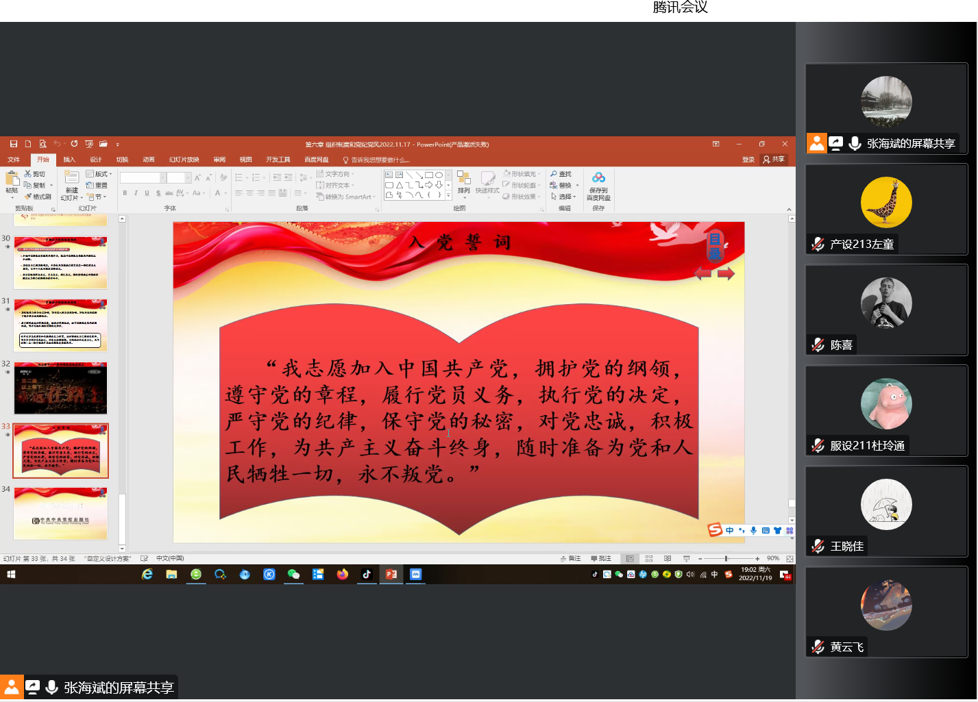 11月19日,服装公司党委书记为2022年入党积极分子讲授党课,内容是《团结统一的基石 拒腐防变的法宝——党的组织制度和党纪党风》,伟德体育官方网站30名入党积极分子在线上聆听了此次党课。