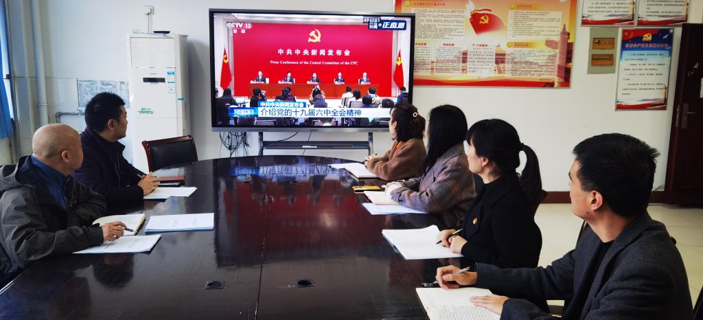 首先会议集中观看了十九届六中全会新闻发布会,介绍党的十九届六中全会精神。