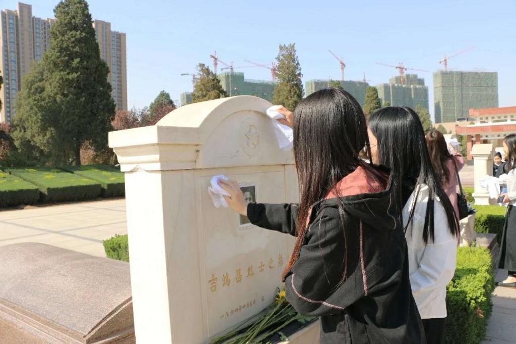 3月30日上午,进入烈士陵园后,苍柏凝翠,同学们排成整齐的方队缓步向前到达刻有周恩来题词“革命先烈永垂不朽”的纪念碑前,集体默哀一分钟;大家怀着崇敬感恩的心情,瞻仰了代表实现民族解放、国家富强和人民幸福而壮烈牺牲的英雄纪念碑亭;最后同学们分别擦拭了英雄们的墓碑,缅怀英雄。
