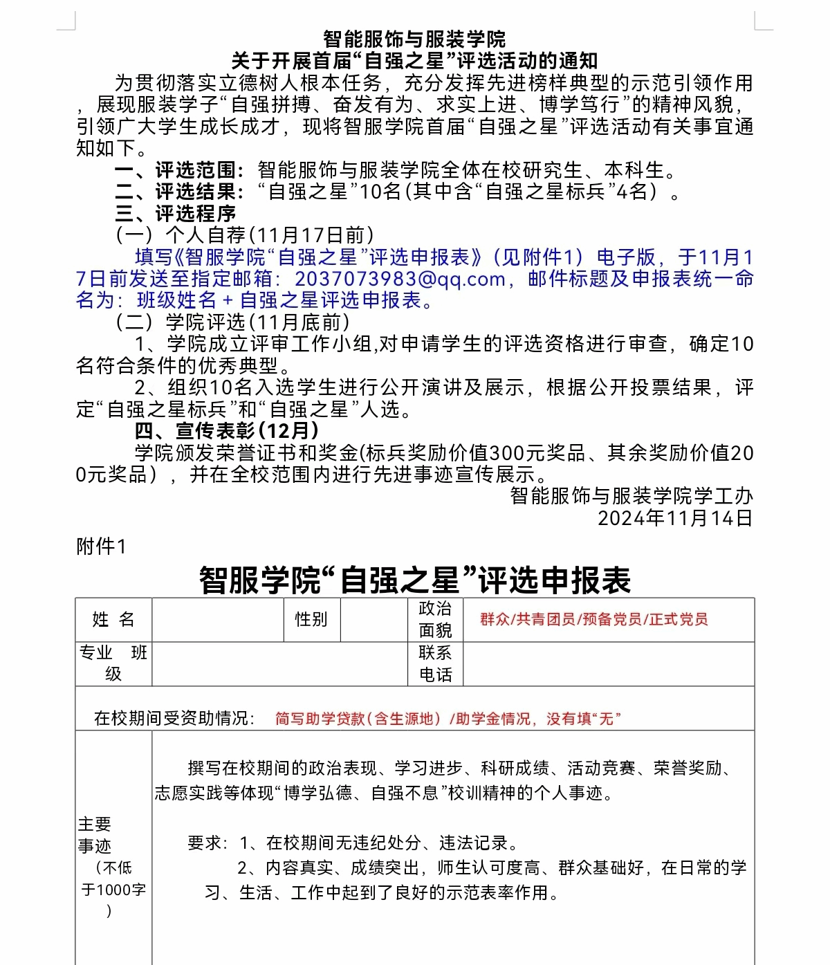 为贯彻落实立德树人根本任务,充分发挥先进榜样典型的示范引领作用,展现服装学子“自强拼搏、奋发有为、求实上进、博学笃行”的精神风貌,引领广老员工成长成才,智服公司于11月14日,面向公司全体在校研究生、本科生,正式启动首届“自强之星”(含“自强之星标兵”)评选活动。