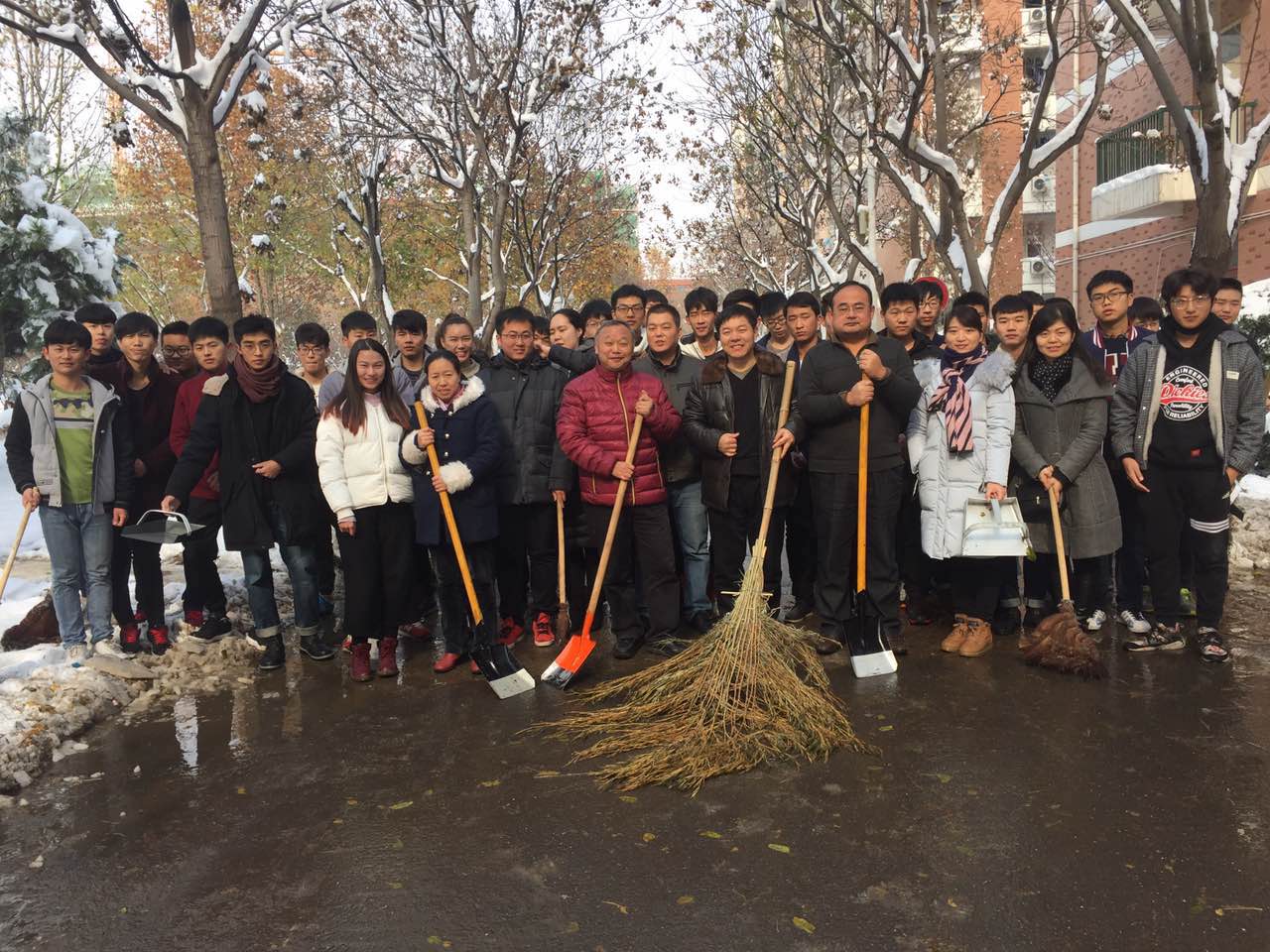 在分包的卫生区域,大家争先恐后地挥舞着从后勤管理处借来的铁锹、扫帚,尽管天气寒冷,但是大家都干的热火朝天。不到半个小时,分包区域内的道路都被清扫干净,为过往师生和车辆带来了方便。