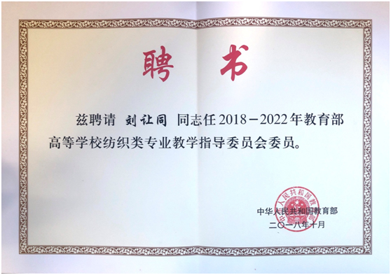 公司伟德体育官方网站刘让同教授被聘为2018-2022年教育部高等公司纺织类专业教学指导委员会委员。