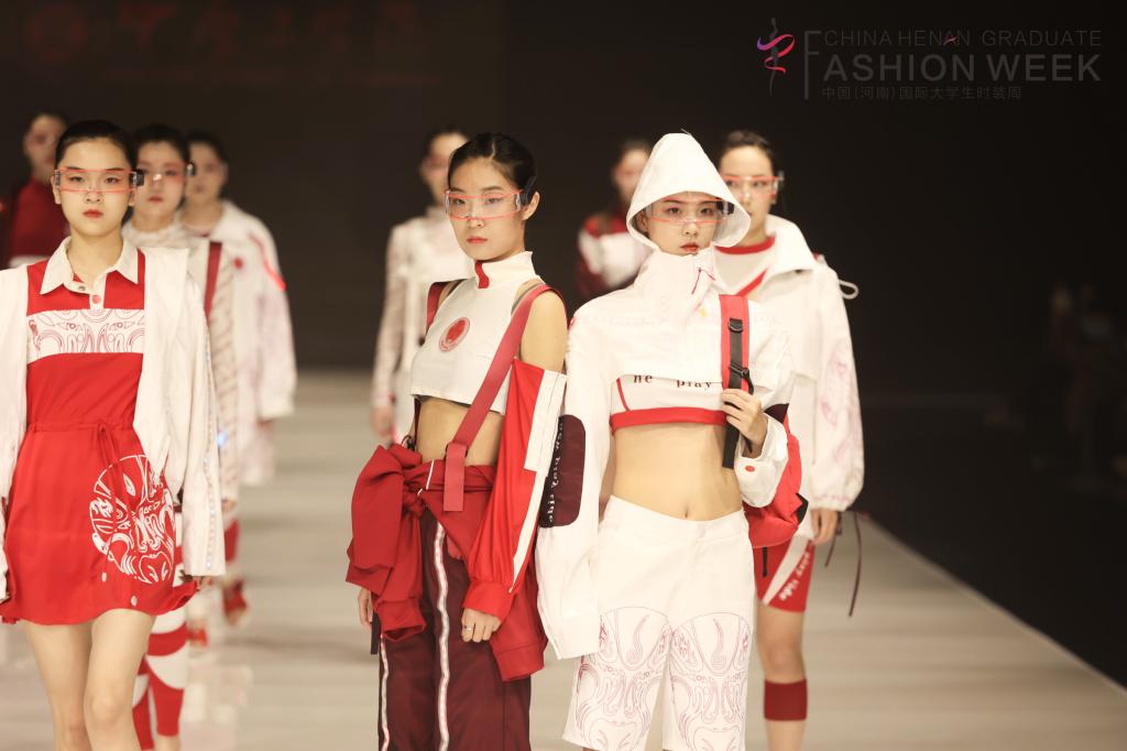 发布的服装设计作品有运动装、舞台装、职业装和裤装四个模块,涵盖休闲运动装、户外功能性运动装、礼服、汉服、创意装等多样的类型。反光材料、LED灯、智能穿戴的设计与应用,通过材质的创新展现新形式的“智能运动服饰”;黄河流古仰韶文化中的彩陶纹样、河南民间艺术通过设计师的再造与创新,展示出非物质文化遗产的时代新风貌,表达对传统文化的尊重与热爱。从质感和色彩上重新整合材料资源,针对不同职业特征和裤装品类进行个性化定制设计。通过服饰工艺与技术进行实践创作,展现服装学子倾心创意、探索求新的设计态度。