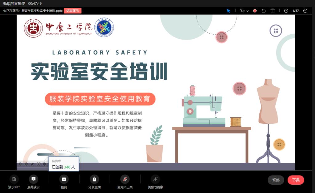 2023年10月11日中午,伟德体育官方网站综合实验中心甄琪老师线上直播,对全体服装新生进行了伟德体育官方网站专业实验室的安全教育,安全教育采用企业微信直播的方式,主要包含实验室安全管理、实验室安全使用和通识类水电安全知识。通过本次培训,使新生了解伟德体育官方网站实验室基本情况、功能用途和安全管理规章制度,为专业学习和课程实践打下良好的安全基础。可爱的新生同学们利用休息时间完成了安全学习,精神可嘉。