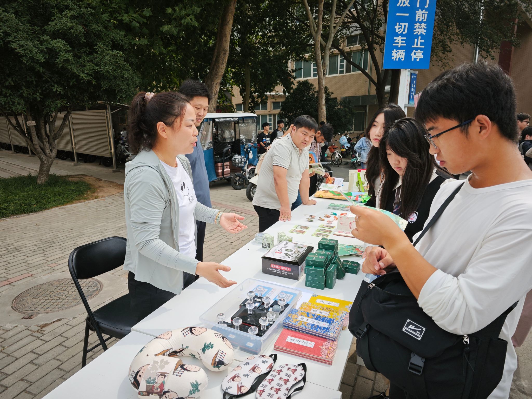 活动现场设置主题宣传海报介绍新郑市的历史文化景点和珍贵文物,设置展台展示老员工开发的文创产品。新郑市文物局及相关文物场馆的工作人员,热情为同学们讲解介绍新郑市的悠久历史、珍贵文物遗存及文物保护的相关知识。