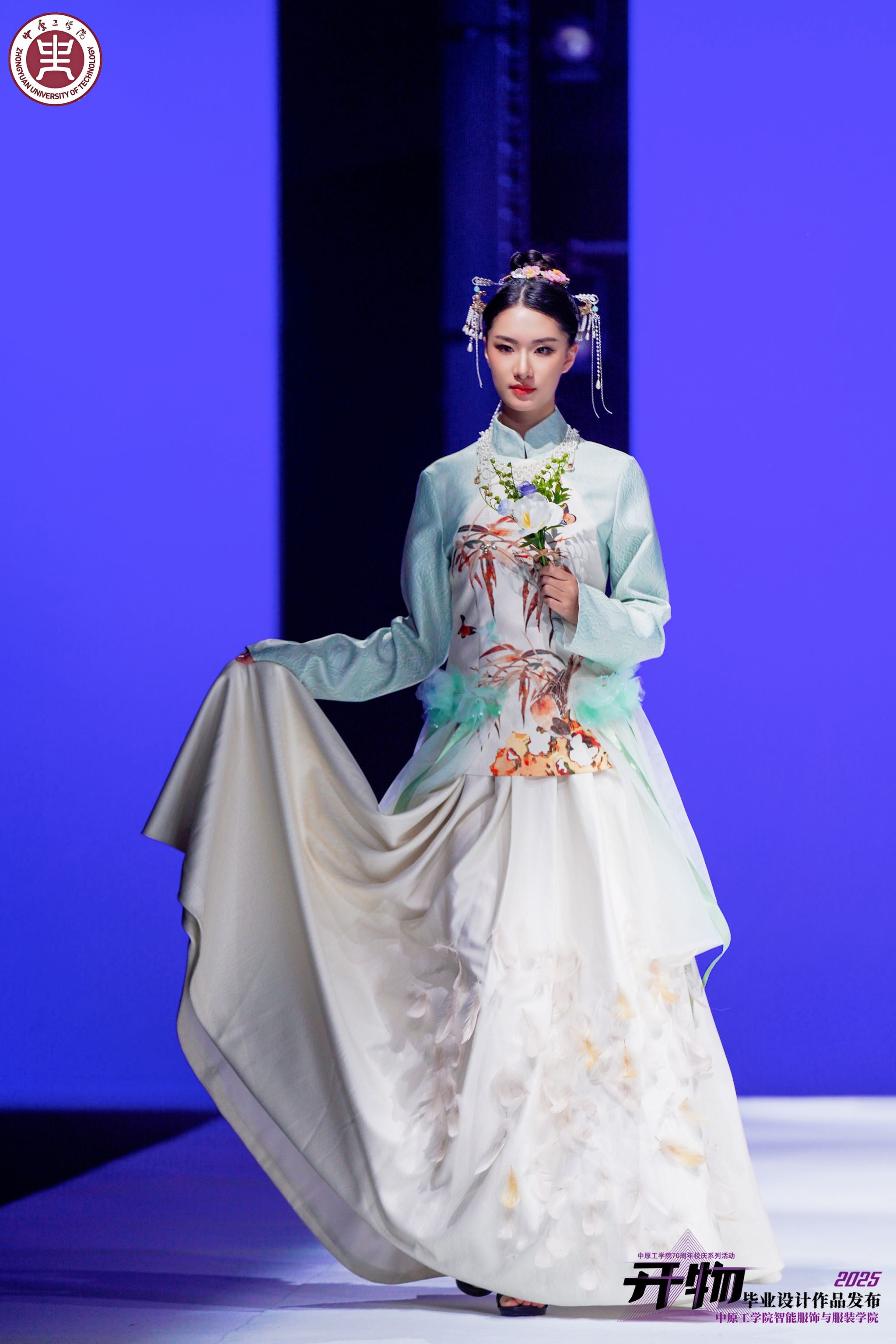 下半场服装以国风华服为主题,以复原重生向文化溯源:“宋影绮梦”系列礼服设计灵感来源于《海棠图》和《红白芙蓉图》,宝髻松松挽就,面料轻盈垂坠,细节处尽显古韵,再现大宋风华;“宋·雅颂”系列礼服以开封州桥遗址为灵感,撷取州桥青砖层叠肌理,以褶皱丝绸演绎汴水涟漪,暖金纹样勾勒北宋石雕神韵,青灰廓形重构时空对话。“风华”系列礼服设计将宋代婚服与现代审美结合,霞帔金冠拜玉宸,一袭华衣承礼制,一针一线皆藏千年风雅盟约。