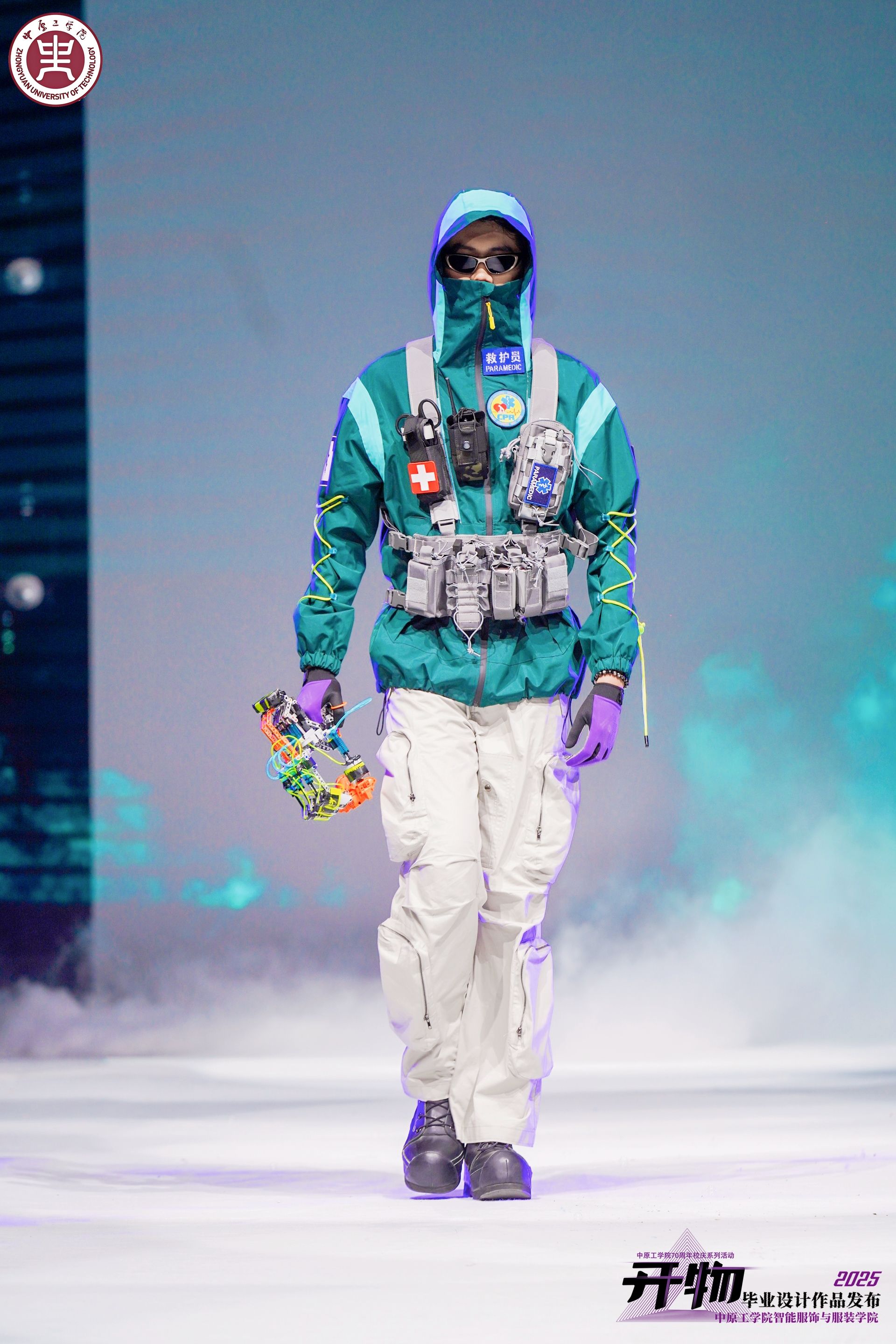 本次展演的服装作品包括运动装、职业装、礼服等类型,上半场以运动装、职业装为主题,充分展示新锐设计师的创新精神和时尚创意:“机械繁花”系列运动装以设计畅想未来,深度融合科技与自然元素,从奇幻图景汲取灵感,勾勒超时空独特时尚风格;“折界”系列职业装,萃潮汕十二版帖、宋代聘定启状、西方古情书折纸之韵,依衣袂之姿,融古折纸于今风尚;“同生契”系列职业装将智能芯片嵌入工装,工业风融合机能美学,开辟机械师着装创新之路。